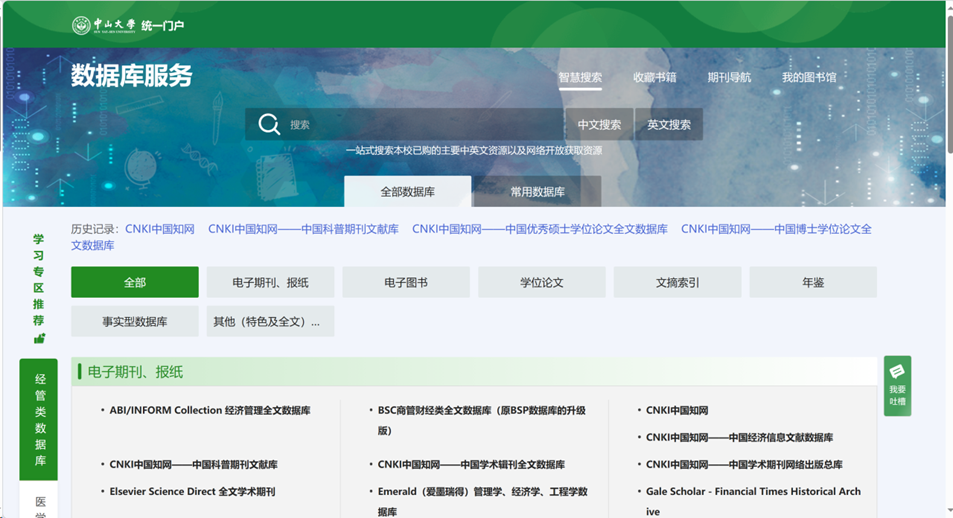 在统一门户的【学术资源访问】中可使用知网、SAGE期刊、SpringLink 数据库、Springer Ebook 电子书数据库、NATURE 等常用的数据库服务。