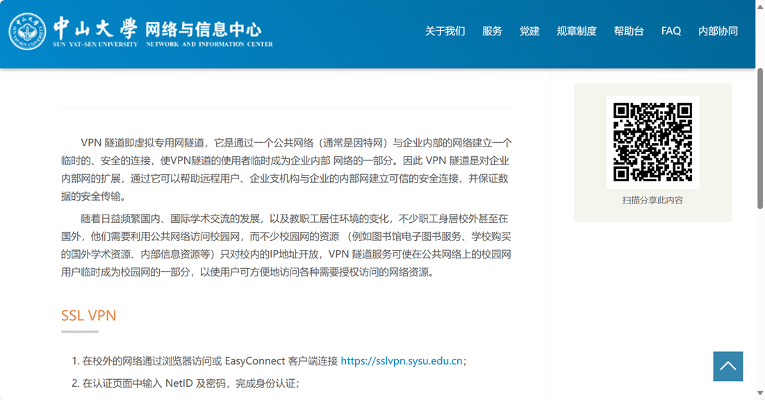 如果前两种方法依然无法满足您的使用需求,您可通过VPN隧道接入中山大学校园网。