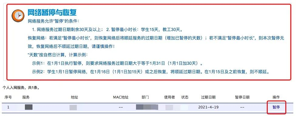 若不满足“暂停最小时长”,则本次暂停无效,恢复网络后不顺延过期日期,请谨慎操作!
