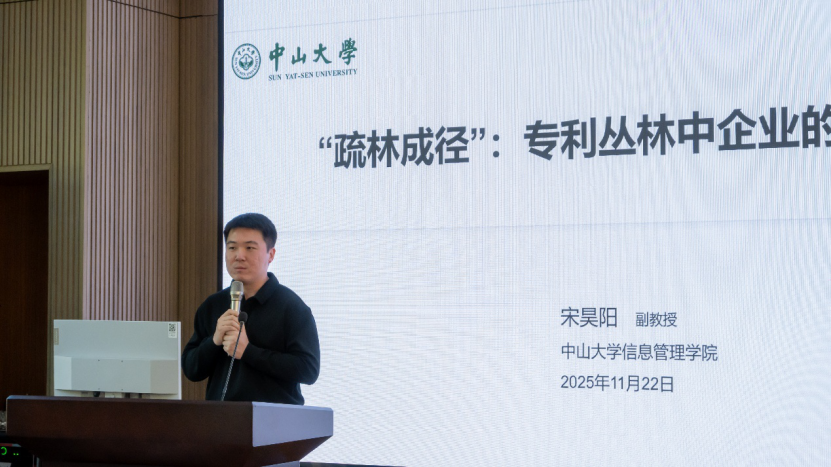 报告五由中山大学副教授宋昊阳主讲,题为《“疏林成径”:专利丛林中企业的技术创新》。宋昊阳老师聚焦于“专利丛林”现象,探讨企业在面对密集专利环境时的创新策略。研究发现,为减少外部依赖,企业更偏好通过内部研发来降低技术相似性与互补性。报告进一步讨论了规模较小或技术基础较弱的企业在专利丛林中的生存之道,呼吁探索更具实操性的应对方向。深圳大学吴登生教授在与谈中肯定了课题的落地价值,指出这为企业在技术锁定困境下寻求知识创新路径提供了理论支撑。