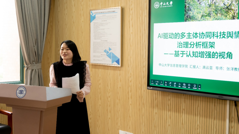 报告三由pg麻将胡了试玩-麻将胡了技巧-pg麻将胡了2 博士研究生高云芸主讲,题为《AI驱动的多主体协同科技舆情治理分析框架——基于认知增强的视角》。报告针对传统单向度治理模式的不足,提出了“人类价值理性主导、AI认知能力增强”的人机协同新范式。高云芸同学构建了包含监测预警、协同决策等维度的治理框架,认为AI驱动的多主体协同治理是科技舆情治理发展的必然趋势,为提升治理效能提供了新的理论视角。