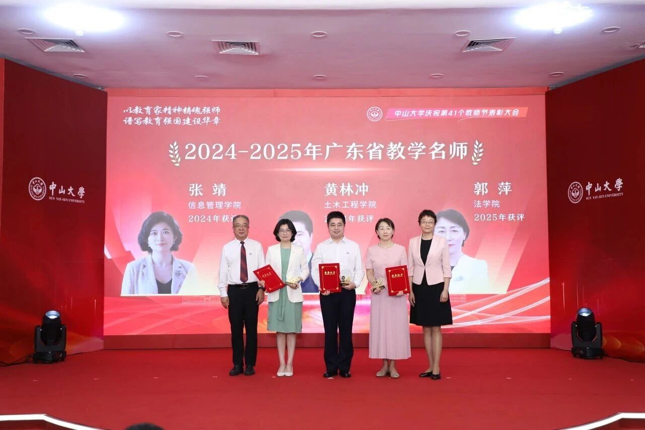 此外,2024年,张靖教授获评“广东省教学名师”称号。2025年9月7日,在中山大学庆祝第41个教师节表彰大会上,中山大学杨清华常务副校长、国亚萍常务副书记为广东省教学名师颁奖。